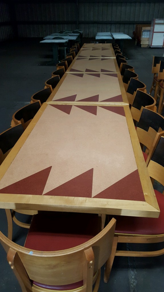 This Aztec Table & Seating 30″ x 48″ rectangular laminated table top is 1 1/8″ thick, and has a walnut look finish on one side and an oak finish on the other side. The black vinyl molding on the edge protects it from chipping and scuffing.