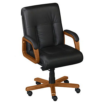 Executive chair features a hardwood capped five star base, knee-tilt mechanism, and instant lift seat height adjustment.