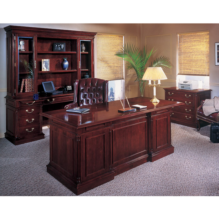 The manager desk from the DMI Keswick Collection offers a center drawer with a pencil tray, two pull out writing boards, and a box, locking box & file per pedestal.