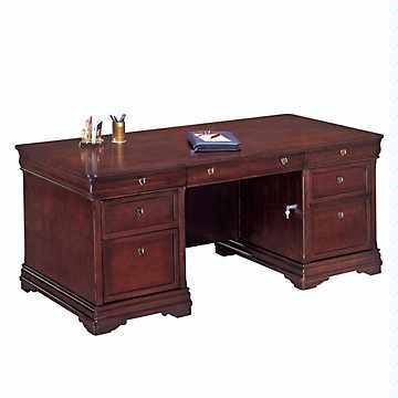 Also features a felt-lined box drawer with pencil tray, box drawer with dividers, and 1 file drawer per pedestal. Middle box and file drawer on each pedestal secure via kneehole lock.