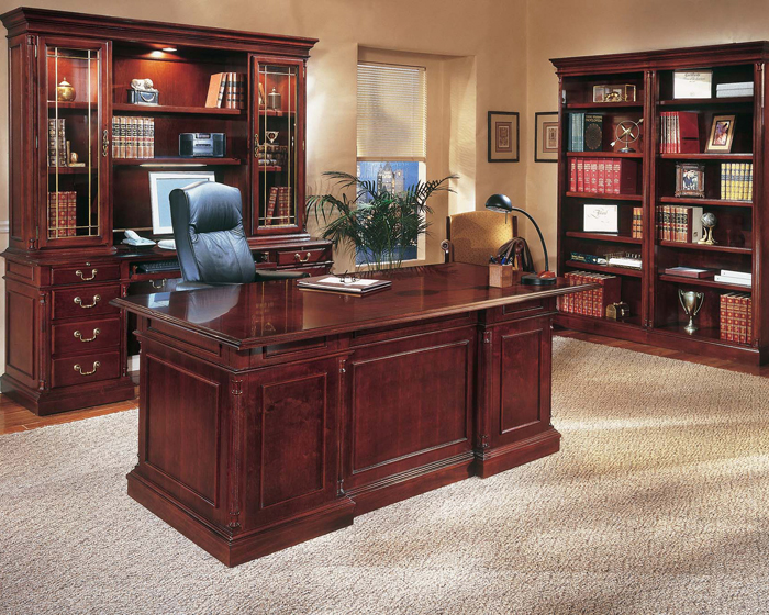 Mirroring the stateliness of early American history, the Keswick Collection has proven to be the majestic leader within traditional office environments. Offered in an impeccable English Cherry finish on cherry veneers with solid wood pilasters, bases, and shaped mouldings; Plated Brass finished pulls; and desks with both felt-lined center and top drawers, this collection emphasizes refined, traditional styling and unmatched luxury. Overhead Storage options include etched glass, leaded glass, or brass screen panel doors. Available with either an inlaid cherry veneer top bordered by walnut banding that is finished with a durable Ultra-Violet topcoat to prevent stains, mars, and scratches or a straight-grain, High Pressure Laminate Top, this collection is sure to please for many years to come. The Keswick 7990 in Laminate top options is on our GSA schedule.