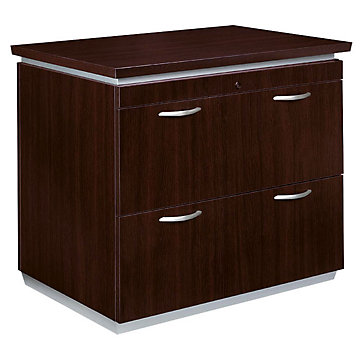 DMI Office Furniture Pimlico Collection lateral file is constructed of wood and wood products with a thermally fused laminate surface. Pimilco combines a Mocha finish with satin aluminum bases and framed frosted glass modesty panels.